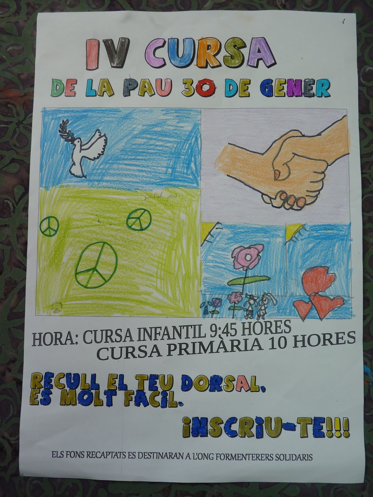 Ahir, dia 23 de gener ens hem ajuntat amb la classe de 2nA per dissenyar els cartells que penjarem als diferents establiments de Formentera per tal d'impulsar la participació a la cursa solidària organitzada pel nostre centre, i que tindrà lloc el proper 30 de gener, dia mundial de la PAU. Dia a dia treballem la pau a la nostra escola, intentant transmetre sempre la seva essència amb els nostres pensaments i accions. Dia 30 serà un bon dia per parar i pensar en les coses que estem fent bé, i en les que potser podem millorar si hi posem bona voluntat. Els sous recaptats es destinaran a la ONG Formenterers Solidaris, la qual no sols té un impacte local sino que participa en diferents projectes arreu del món.